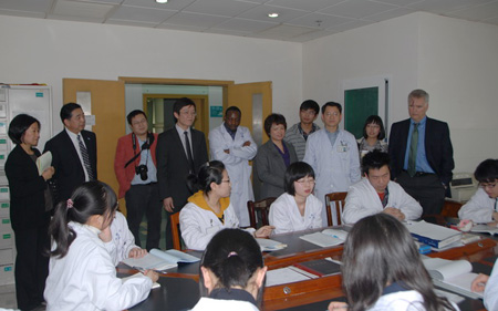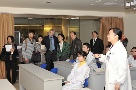 在考察医院临床技能训练中心时,看到Simman/Simbaby教学实况,以及参加2011年第二届全国大学生临床技能竞赛选手的训练情况, Dr. Hongping Tian 和Dr. Robert Rohrbaugh对医院本科生教学工作给予了高度评价,并在留言本上写下了“WHAT A TERRIFIC RESOURCE !!”