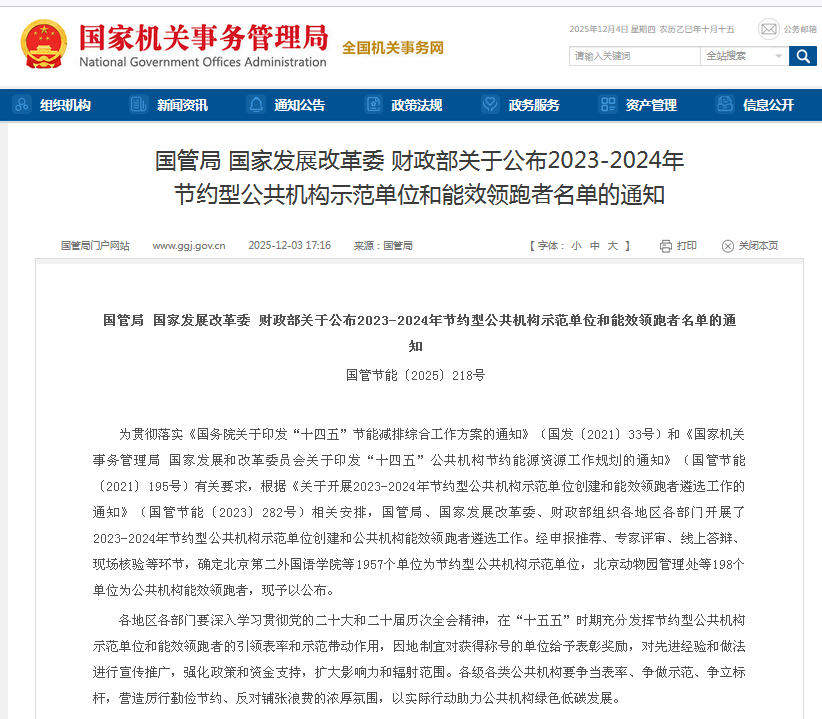 近日,国管局、国家发展改革委、财政部公布了2023-2024年节约型公共机构示范单位和能效领跑者名单,经申报推荐、专家评审、线上答辩、现场核验等环节,确定1957个单位为节约型公共机构示范单位,198个单位为公共机构能效领跑者,我校获评公共机构能效领跑者。