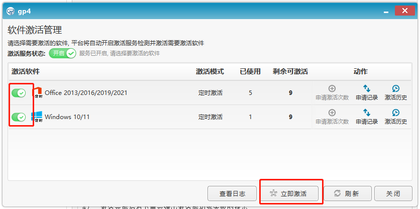 3) 点击左边的选项按钮,勾选需要激活的产品,然后点击“立即激活”