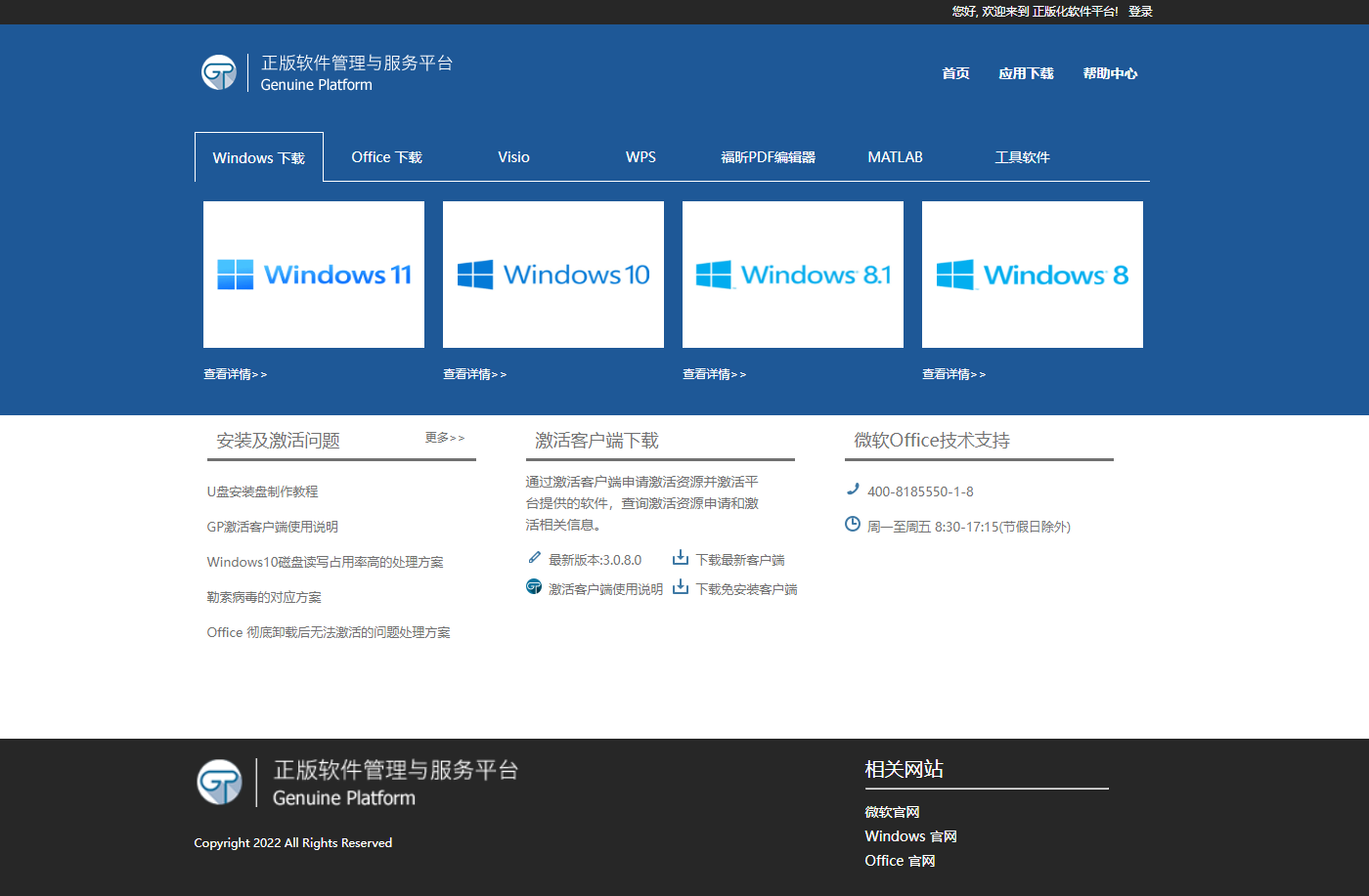 3. 激活Windows和Office1) 安装完成后会自动弹出登录界面,登陆后点击网页上登录客户端按钮。2) 登录成功后,软件自动弹出商品激活管理窗口(Windows和Office默认各分配10次激活次数)